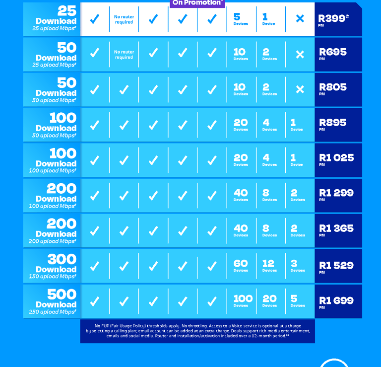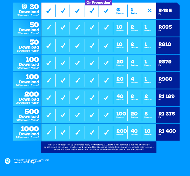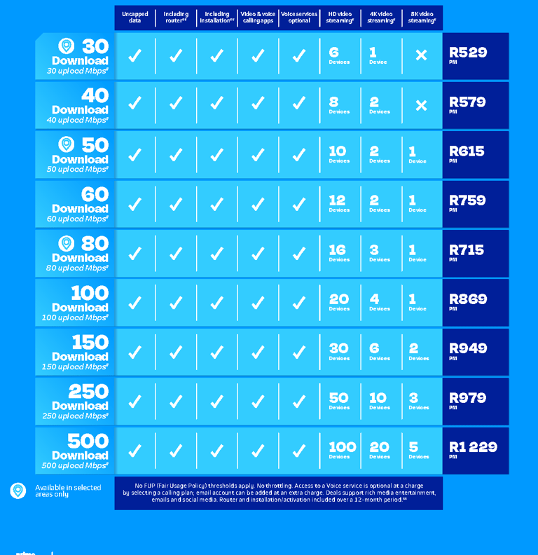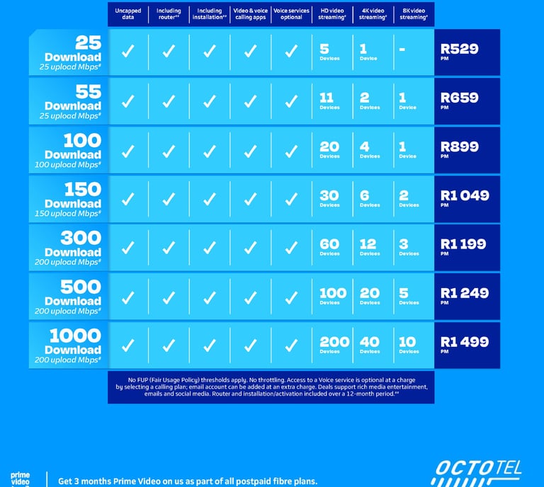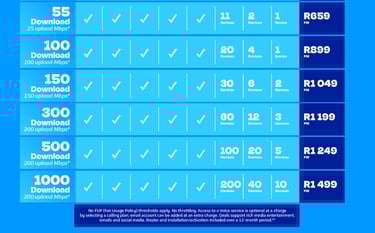 Get reliable, high-speed fibre internet for your home with flexible packages that suit your budget. We connect you through South Africa’s leading fibre networks including Openserve, Vuma, Metrofibre, Frogfoot, and Octotel. Enjoy fast speeds, stable connections, and seamless streaming, gaming, and working from home.